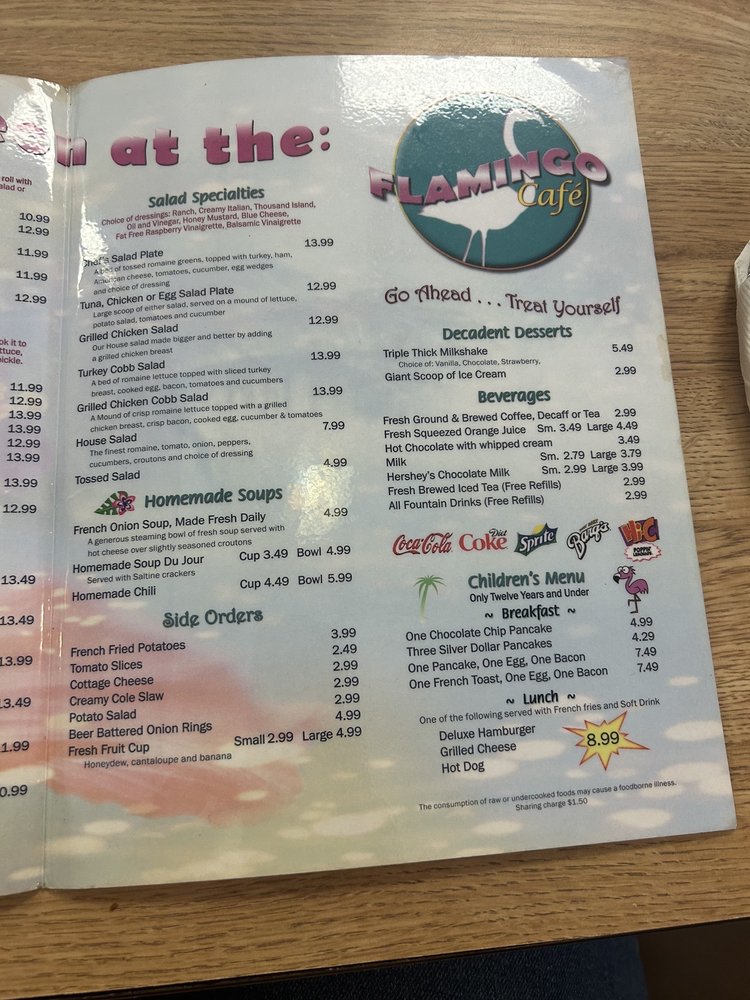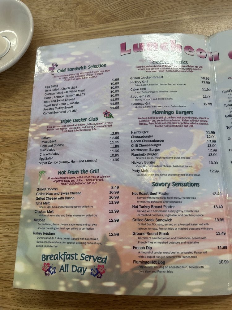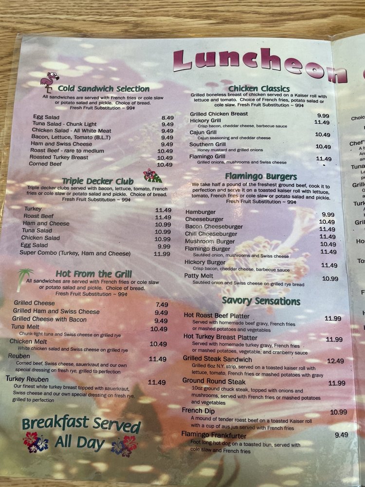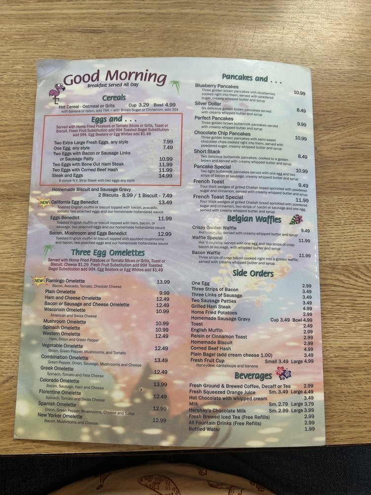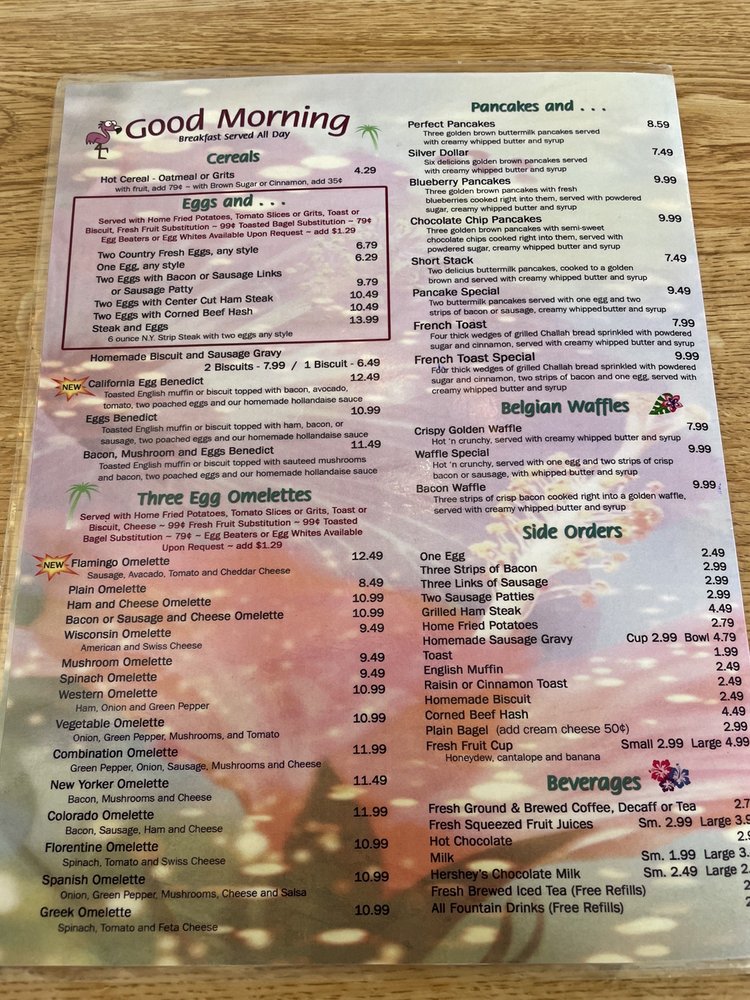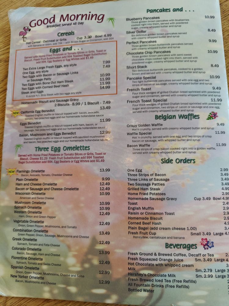 Introducing Flamingo Cafe, a vibrant cafe located in Palm Beach Gardens, FL. Offering a range of amenities like takeout, reservations, delivery, and catering, this cafe is known for its many vegetarian options and friendly service. Customers rave about the delicious food, with standout dishes like perfectly cooked eggs, flavorful omelets, and custom vegetarian meals. The cafe's welcoming atmosphere and generous portions make it a great spot for breakfast, brunch, or lunch. With attentive staff and a variety of offerings from happy hour to outdoor seating, Flamingo Cafe is a must-visit for a satisfying dining experience. Whether you're in the mood for a classic bacon egg and cheese on a roll or a creative Florentine omelet, Flamingo Cafe has something for every taste.